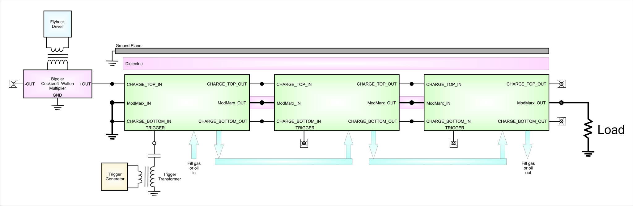 Three Stage Single Ended Marx Published April 22, 2018 - size: 2048 × 667 in Three Stage Single Ended Marx ← Previous Next → Figure 7 – Multiple ModuMarx modules may be stacked to increase the output voltage. Theoretically, the open-load output voltage of this 3-module Marx generator is 1.35MV. Read More... High voltage Marx generator built from ModuMarx modules (c)2018 David Prutchi PhD