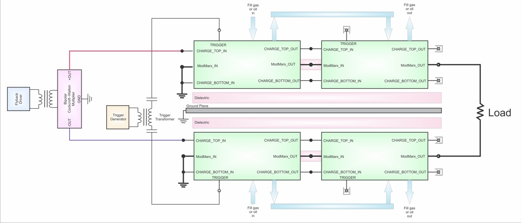 Figure 8 – ModuMarx modules can also be connected to form a full bipolar pair. For example, this bipolar Marx generator with two ModuMarx modules for each polarity would produce a theoretical maximum open-load output of ±900kV, or 1.8MV between the outputs.